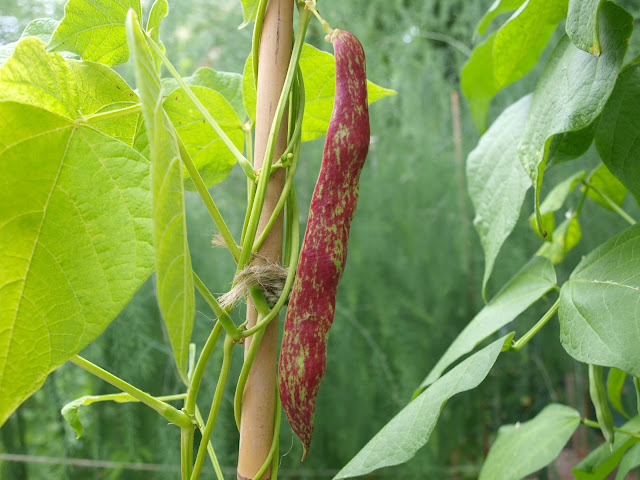 The climbing beans are swelling up nicely. Most of the Borlotti "Firetongue" are speckled with red streaks now.
