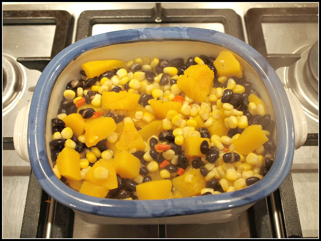 Cooking this dish is in truth not a great culinary challenge, it's mainly an "assembly job". The key thing is to get all three main ingredients cooked to the right degree without anything going mushy, so you can't just put them all in a pan and boil them up. I therefore pre-cooked the beans (after soaking them in water for several hours). Likewise I cooked the Butternut Squash first, and added the beans and Sweet Corn later on.