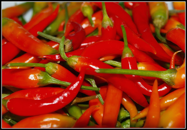 I have picked the last chillis of the year. The two "Turkey" chilli plants that I had been keeping in the garage have been consigned to the compost bin. But, wow, did they go out with a blaze of glory! I couldn't resist according them a final photo opportunity...