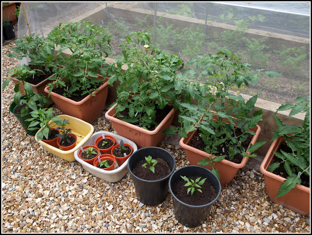 The bush tomatoes are in their pots alongside the bed with the carrots in. Seen in the photo below are also some of my chillis - mostly small ones still awaiting potting-on into black 10" pots like the two in the foreground.